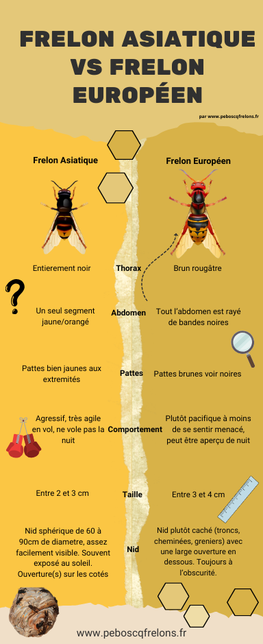 Les frelons asiatiques et européens peuvent être différenciés par plusieurs caractéristiques décrites sur notre infographie :